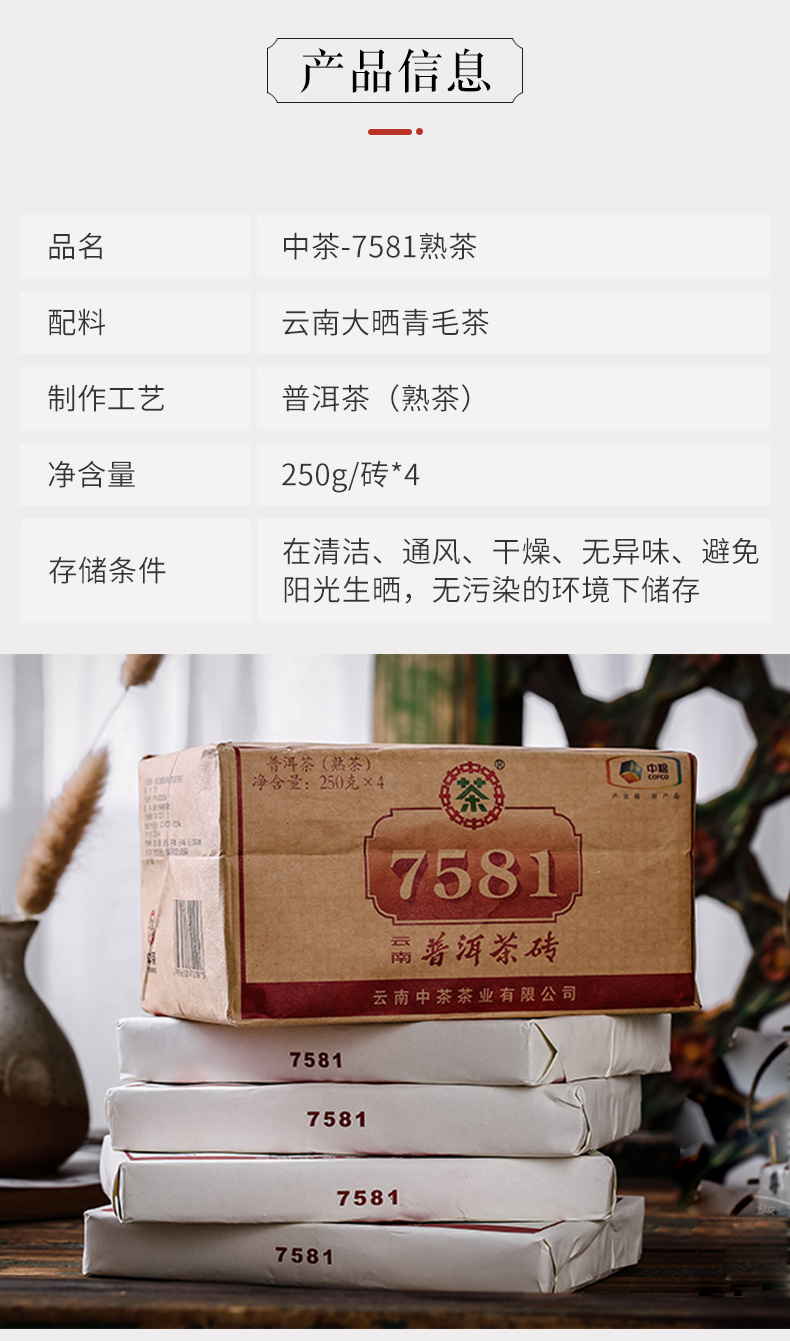 温馨提示:中茶龙泉茶庄专卖店提供中茶7581详细参数及中茶7581图片,另对中茶普洱茶 2020年云南普洱熟茶砖经典7581砖茶四片装250g*4 中粮商品的详细介绍及说明负责,如您对中茶7581产品描述、图片等有疑问请点击我要质询联系中茶7581客服 我要咨询